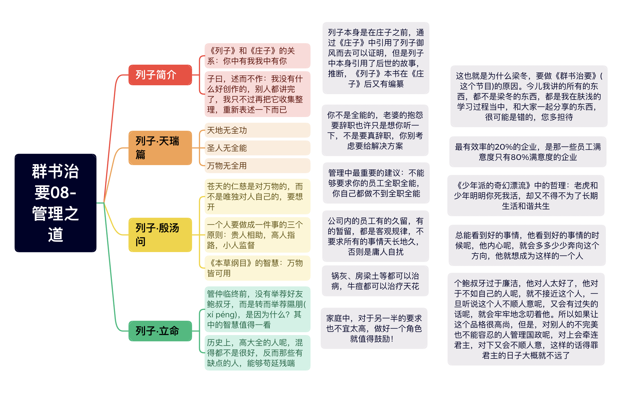 说这个列子呢,他呢,在《群书治要》里面,他摘了几篇关于这一个管理学方面的心得。其中呢,第一篇呢,他引用了《天瑞篇》——《列子·天瑞篇》里面——他讲说,天地无全功,圣人无全能,万物无全用。这什么意思呢?就是啊,任何一个东西呢,都不全面,都是有它的不足的地方。这话,反过来看就是,任何没有用的东西,或者你觉得不靠谱的东西,它也是有用的。
